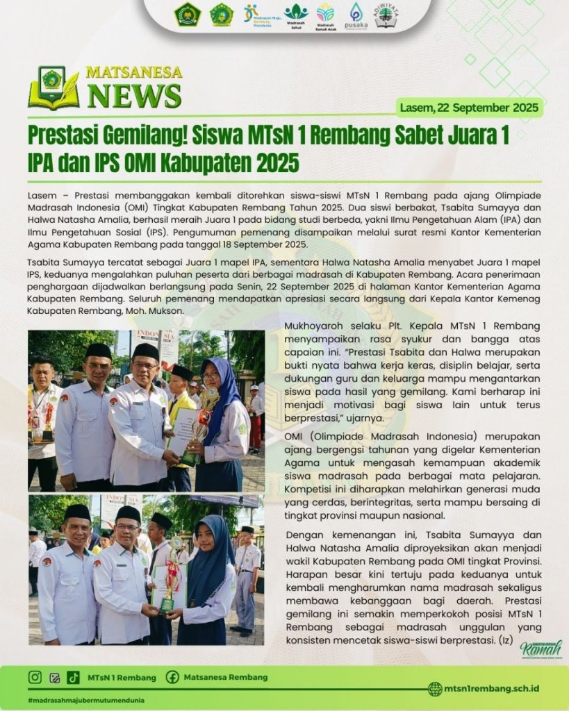 Lasem – Prestasi membanggakan kembali ditorehkan siswa-siswi MTsN 1 Rembang pada ajang Olimpiade Madrasah Indonesia (OMI) Tingkat Kabupaten Rembang Tahun 2025. Dua siswi berbakat, Tsabita Sumayya dan Halwa Natasha Amalia, berhasil meraih Juara 1 pada bidang studi berbeda, yakni Ilmu Pengetahuan Alam (IPA) dan Ilmu Pengetahuan Sosial (IPS). Pengumuman pemenang disampaikan melalui surat resmi Kantor Kementerian Agama Kabupaten Rembang pada tanggal 18 September 2025.